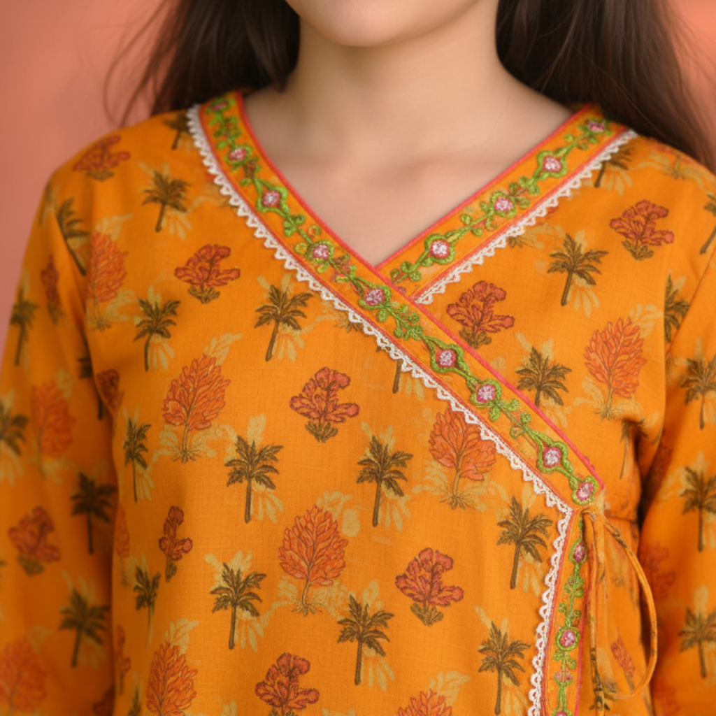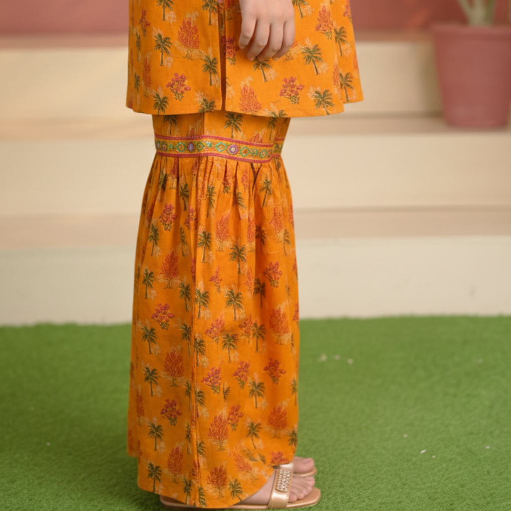 The beautifully stitched shirt features a classic floral print in rich orange tones, inspired by traditional eastern patterns. Delicate contrast detailing along the neckline adds an elegant finish, while the matching lawn Gharara offers ease of movement and all-day comfort.