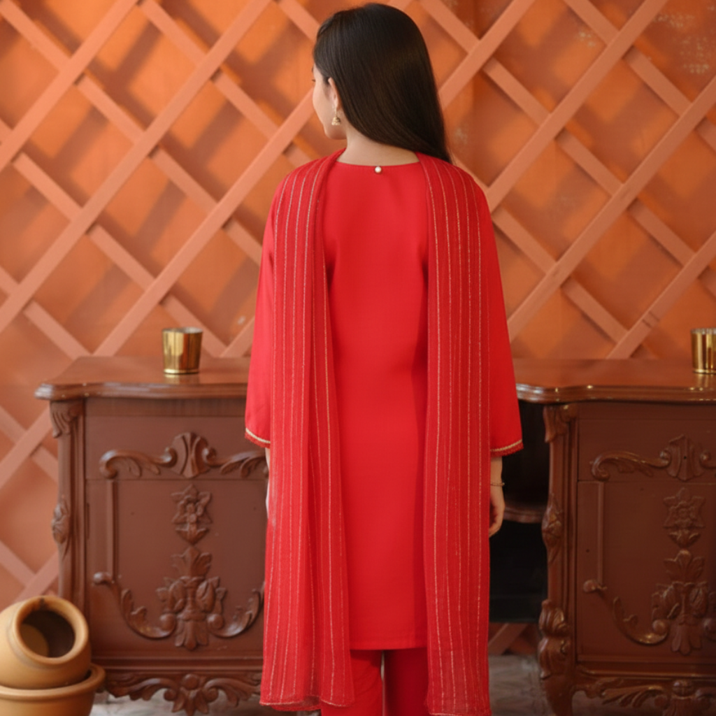 The suit features a gracefully stitched shirt with a koti-style layered look, enhanced with beautiful, detailed embroidery that adds richness and festive appeal. The matching trousers offer a comfortable and neat fit, while the coordinated dupatta completes the outfit with a refined traditional finish.